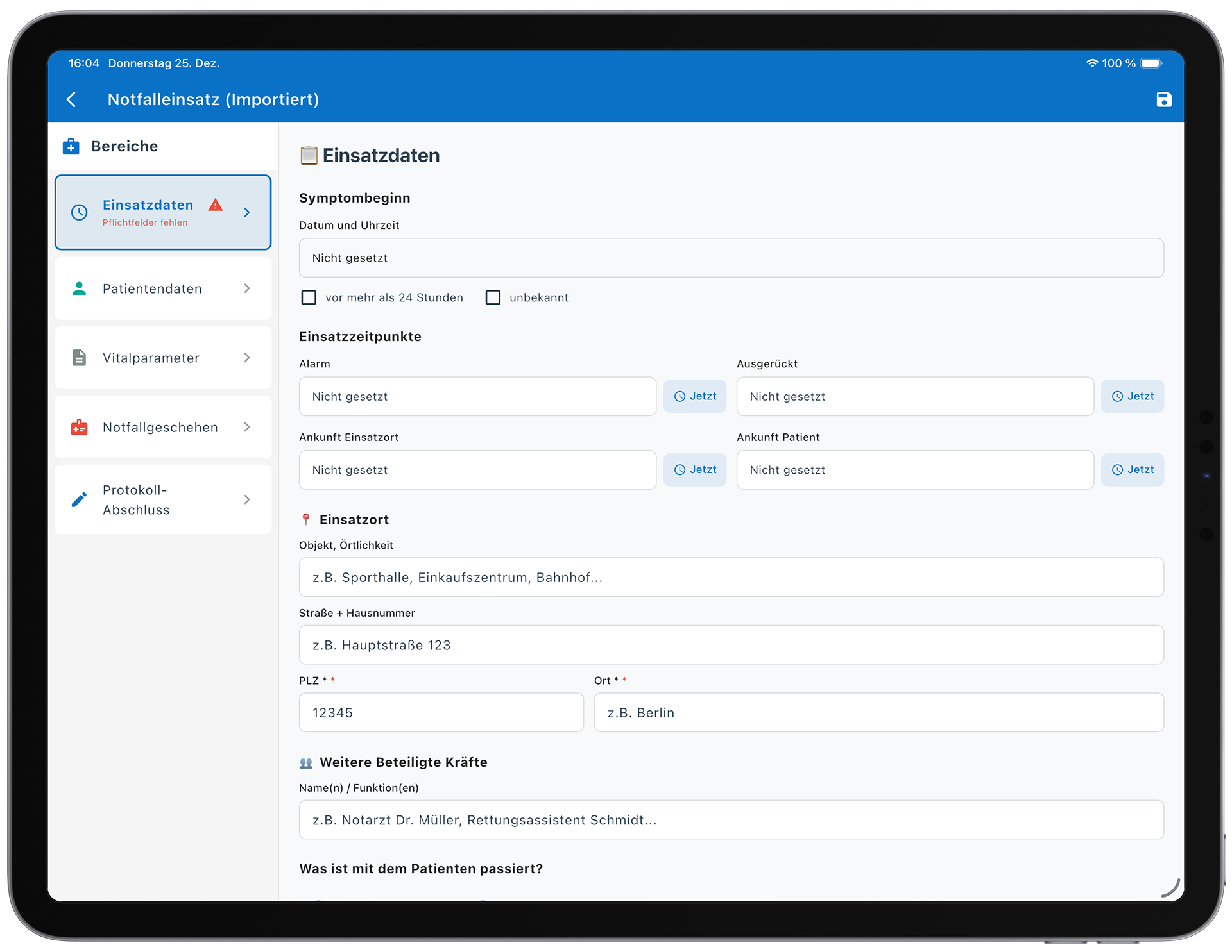 Dokumentation direkt am Einsatzort: Die native App funktioniert auch ohne Netz. Protokolle erfassen, wo sie entstehen – am Patienten, im Fahrzeug, auf dem Festivalgelände.